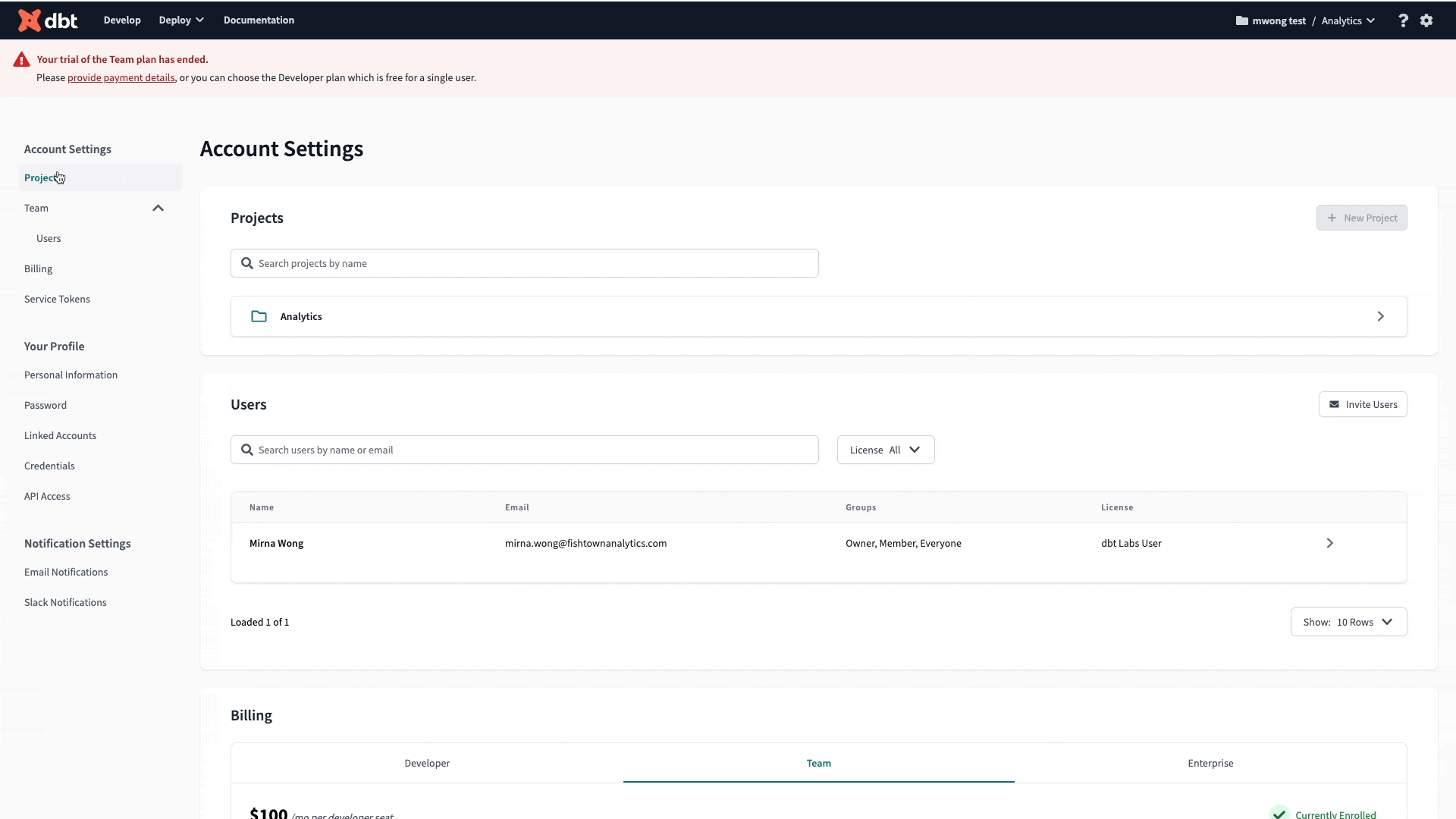 • Under Billing, you can review the available dbt Cloud plans and their features